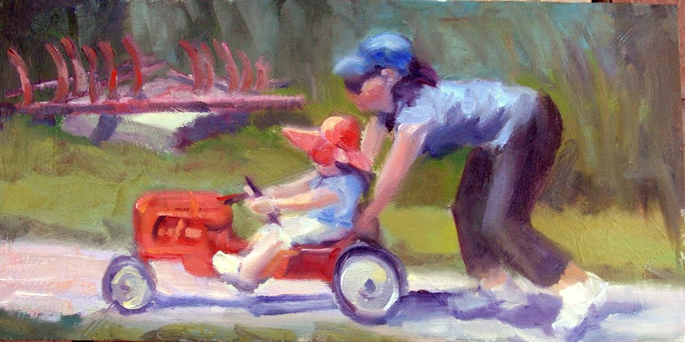 I just finished with the Stem's Plein Air Festival here in Kansas City. This spring has been plagued with rain and thunderstorms, plus a few tornadoes. One morning I was painting the little blue garden shed at the Arboretum. The weather was overcast, and it started to sprinkle lightly. Most of the other artists packed up and left. I thought to myself..... Now a plein air artist should be prepared to paint in any weather.... so I smugly put up my umbrella and continued to paint. About 15 minutes later the heaven's opened up and it started to pour.... lightening was flashing, and then the tornado sirens started to blare. I was fighting my umbrella, while tyring to get all of my gear stored away as my paint bag was filling with water. I was a mess. By the time I got everything together.... I could not find anyone! Finally I found someone running through the parking lot, and followed them to a tornado shelter. That is where the other artists were.... snug and dry, and I was soaked! The tornado was sighted close by.... and was the same one that hit Sedelia, Missouri. I was very fortunate! About 30 minutes later.... the sun come out!